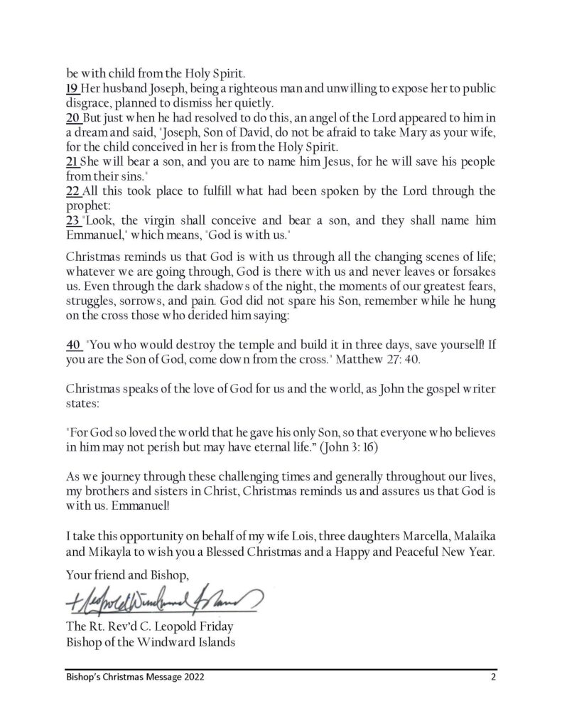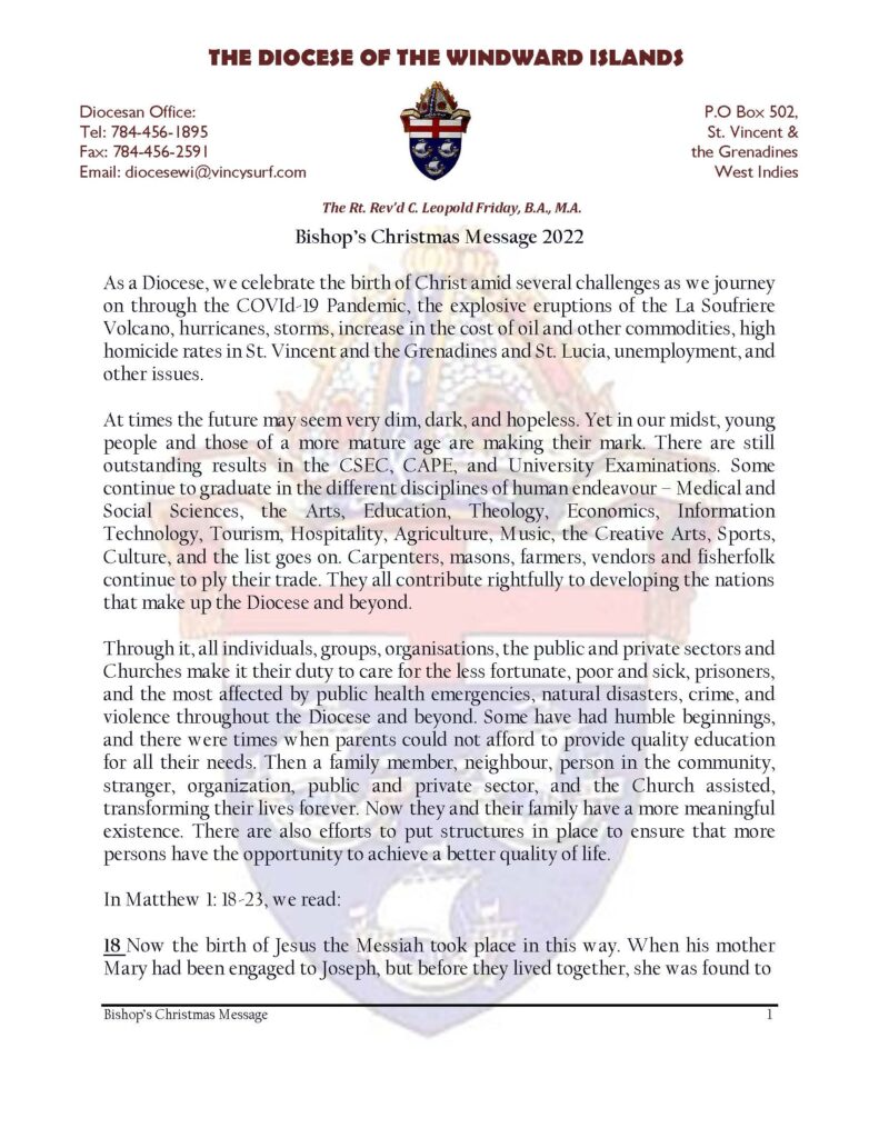As a Diocese, we celebrate the birth of Christ amid several challenges as we journey on through the COVId-19 Pandemic, the explosive eruptions of the La Soufriere Volcano, hurricanes, storms, increase in the cost of oil and other commodities, high homicide rates in St. Vincent and the Grenadines and St. Lucia, unemployment, and other issues…